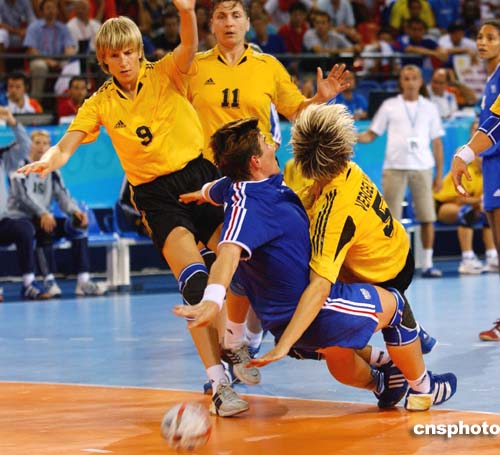 圖為當?shù)貢r間28日,法國隊與韓國隊在手球比賽場上的爭奪。