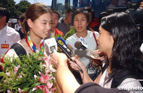 八月三十一日,中國奧運健兒載譽回國,在北京首都國際機場受到熱烈歡迎。圖為奧運跳水冠軍吳敏霞在機場接受媒體采訪。中新社記者:武仲林