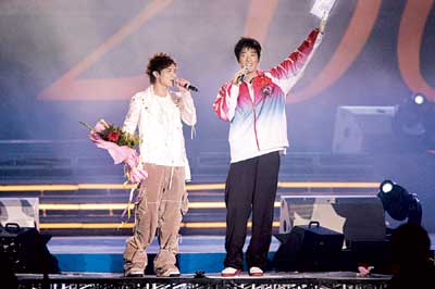 昨晚,相信出現(xiàn)在奧體中心體育場“同一首歌·為奧運喝彩”晚會的觀眾見到的絕對是史無前例的黃金歌手組合。首先出場的是著名歌手孫楠和他的最新搭檔——中國羽毛球隊金牌教練李永波,兩位嗓音同樣出色的大腕演唱的《紅旗飄飄》,贏得滿場喝彩。青春偶像張柏芝當(dāng)晚的搭檔是萬米長跑奧運冠軍邢慧娜。張柏芝說想親吻一下那塊金牌,邢慧娜俏皮地說:“我沒帶,不過你唱歌給我聽,我就讓你親!庇谑牵瑑扇艘煌堇[了一首《星語心愿》讓大家過了把癮。之后還有孫國慶、李春波、黃鶴祥等歌手和奧運冠軍們演繹的精彩節(jié)目。