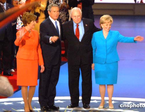 當地時間九月二日晚,美國總統布什在共和黨大會閉幕式上正式接受共和黨總統候選人提名后,與第一夫人勞拉以及美國副總統切尼夫婦一起向全場致意。作者:趙海燕