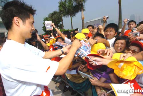 國家奧運金牌代表團9月7日在香港展開觀光之旅,9時45分抵達灣仔金紫荊廣場參觀,吸引大批市民圍觀,圖為田亮為熱情的香港市民簽名。作者:趙振清