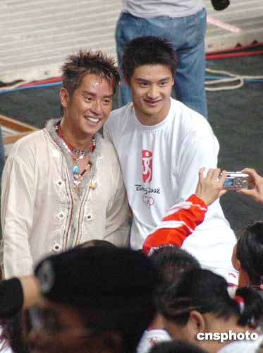 萬眾矚目的“奧運精英大匯演”7日晚上在香港大球場舉行,國家奧運金牌選手和數(shù)萬名香港市民會聚在此,共享中國在雅典奧運會奪金的喜悅和榮光。圖為金牌選手田亮邀請演出嘉賓譚詠麟合影。作者:洪少葵