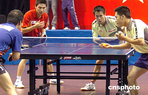 為歡迎國家奧運金牌代表團訪港,九月八日香港舉行“中國人的驕傲--奧運金牌精英顯風(fēng)采”奧運金牌羽毛球及乒乓球表演。圖為奧運乒乓球男子雙打金牌得主馬林、陳杞與銀牌得主香港的李靜、高禮澤進(jìn)行混合友誼賽。中新社記者:錢興強