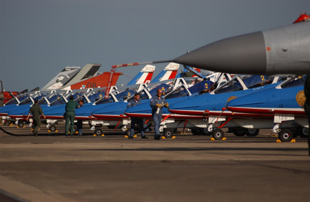 法國(guó)空軍的“法蘭西巡邏兵”飛行表演隊(duì)正式成立于1964年2月。飛行表演隊(duì)的飛機(jī)涂著同法國(guó)國(guó)旗一樣的紅、白、藍(lán)三種顏色,機(jī)群在空中做飛行表演時(shí)也常常把著三種顏色的煙跡留在空中。它象征著“自由”(紅色)、“民主”(白色)、“博愛(ài)”(藍(lán)色),體現(xiàn)了法國(guó)人民勇敢、浪漫的傳統(tǒng)和對(duì)未來(lái)美好的愿望。圖為表演結(jié)束后地勤人員正在作例行檢查和維修(來(lái)源:艦船知識(shí)網(wǎng)絡(luò)版)