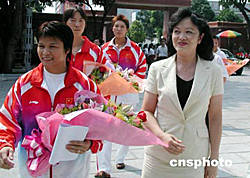 第二十八屆雅典奧運(yùn)會(huì)女子柔道五十二公斤級(jí)冠軍冼東妹的家鄉(xiāng)——廣東肇慶,九月十三日下午舉行盛大的歡迎儀式,并以六十萬(wàn)元人民幣重獎(jiǎng)自己的優(yōu)秀女兒冼東妹。圖為肇慶市副市長(zhǎng)黃玲陪同冼東妹步入會(huì)場(chǎng)。據(jù)悉,肇慶市委、市人民政府授予冼東妹肇慶市勞動(dòng)模范、“三八”紅旗手、“肇慶市杰出青年”等榮譽(yù)稱號(hào)。同時(shí),四會(huì)授予她四會(huì)市勞動(dòng)模范、四會(huì)“三八”紅旗手、“四會(huì)市杰出青年標(biāo)兵”等稱號(hào);四會(huì)石藝國(guó)際集團(tuán)贈(zèng)送一套高級(jí)公寓給冼東妹。作者:黃耀輝