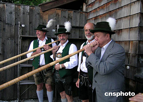 十三日傍晚﹐澳門特首何厚鏵結(jié)束了對(duì)德國(guó)巴伐利亞州一天的參觀訪問(wèn)后來(lái)到阿爾卑斯山腳下游覽﹐當(dāng)?shù)厮嚾舜灯饌鹘y(tǒng)的阿爾卑斯號(hào)角歡迎客人。對(duì)長(zhǎng)長(zhǎng)的號(hào)角﹐眾人皆不得其法﹐只有何厚鏵信手拈來(lái)即能吹響。作者:孫兆震
