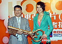 東亞唱片集團董事廖毅榮會上頒發(fā)金鑰匙予何韻詩,寓意雙方合作憑金鑰匙打開勝利之門。