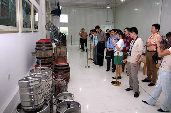 在博物館百年歷史和文化展示區(qū)里,順著時空的脈絡,采訪團成員通過詳盡的圖文資料,了解了啤酒的神秘起源、青啤的悠久歷史、青啤數(shù)不勝數(shù)的榮譽、青島國際啤酒節(jié)、國內(nèi)外重要人物來青啤參觀訪問的情況。