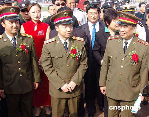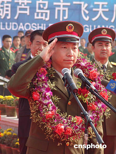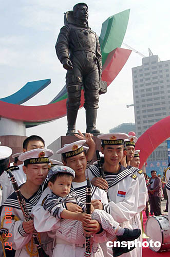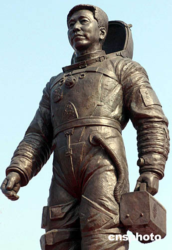 中國航天英雄楊利偉雕像二十七日在家鄉(xiāng)遼寧省葫蘆島市飛天廣場落成,該廣場由中國雕塑家協(xié)會設(shè)計和制作,包括楊利偉寫實全身像、“飛”字抽象主雕、九天柱石雕等六組大型雕塑。中新社記者:錢興強