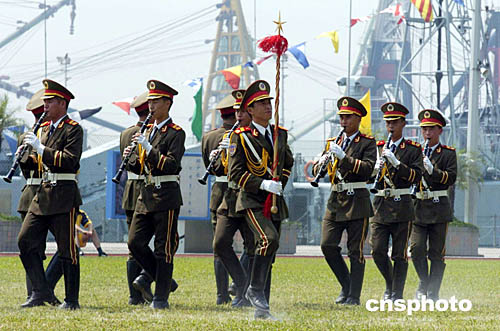 圖為駐軍軍樂(lè)隊(duì)在球場(chǎng)表演《好日子》。