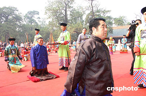 在一片莊嚴(yán)肅穆之中,祭祀隊伍穿“弘道門”,過“大中門”,進(jìn)“同文門”,繞“奎文閣”,越“十三碑亭”,由“大成門”來到孔廟大成殿院內(nèi)。杏壇前,按傳統(tǒng)的禮儀焚香禱告之后,拾級而上至大成殿前祭祀平臺。整個大成殿被裝飾一新,殿前一幅對聯(lián)寫道:“先師功德垂青史,儒學(xué)精華照五洲”;大殿前東西兩側(cè)擺放著古老的樂器編鐘和編磬;祭祀供桌上牛羊豬三牲,透出祭祀的古老與莊重。