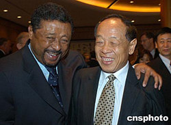 美東時(shí)間九月二十八日晚,中國常駐聯(lián)合國代表團(tuán)舉行中華人民共和國成立五十五周年國慶招待會(huì)。五十九屆聯(lián)大主席、加蓬外長讓·平前往道賀。讓·平的父親程志平祖籍浙江溫州,母親是加蓬人。圖為讓·平與正在紐約聯(lián)合國總部參加一般性辯論的中國外長李肇星親切會(huì)面。作者:陳建