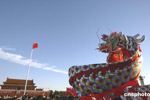 十月一日,北京天安門廣場舉行了隆重的國慶升旗儀式,慶祝建國五十五周年。在升旗儀式上具有中國特色的舞龍表演更加平添了節(jié)日氣氛。中新社記者:盛佳鵬