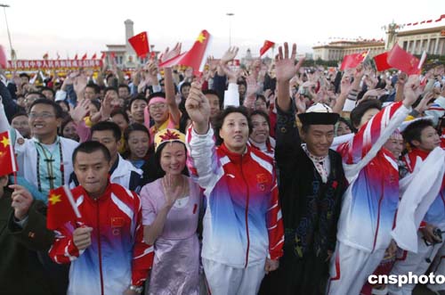 雅典奧運(yùn)會(huì)跳水冠軍彭勃(左一)、排球選手王麗娜(左三)等與首都大學(xué)生一起參加升旗儀式。中新社記者:盛佳鵬
