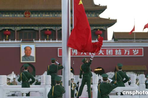 而另一位表情同樣親和的偉人,孫中山先生,其像在城樓對(duì)面廣場(chǎng)上矗立。來(lái)自北京各高校及其他各界人士,此時(shí)正在廣場(chǎng)歡歌起舞。一小時(shí)半前,他們剛剛在此觀看了升旗儀式。那一刻,近處奧運(yùn)倒計(jì)時(shí)器的顯示為一千四百零七天十二小時(shí)零五十一分鐘。