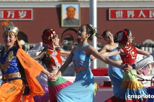 艷陽(yáng)、大風(fēng),北京第五十五個(gè)國(guó)慶日,天安門前人肩勝花海。
