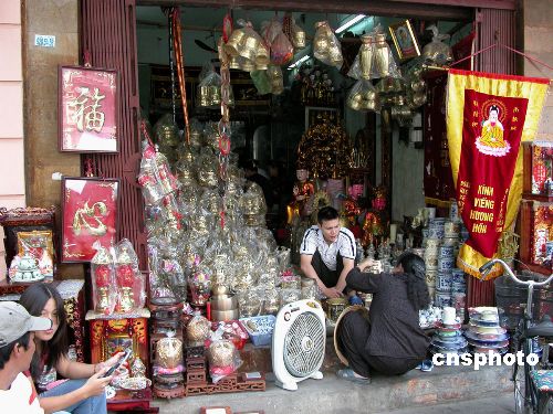 在越南河內(nèi)街頭,隨處可見出售中國商品的小店。一些做工精細(xì)的佛像、陶瓷等中國小商品在河內(nèi)深受歡迎。吳慶才 攝