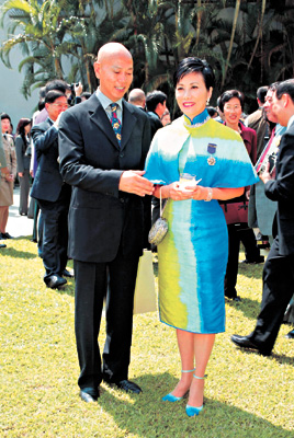 獲頒星章后,“阿姐”在家英陪同下,步進(jìn)禮賓府的草地參與酒會,期間家英充當(dāng)攝影師,不停為“阿姐”與其它嘉賓拍照留念。雖然記者起哄要他親“阿姐”以示道賀,但卻食了“阿姐”的檸檬。