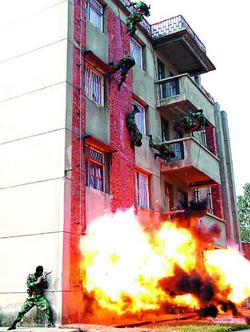 中新網(wǎng)10月11日電 沙場(chǎng)秋點(diǎn)兵,反恐出精英。長(zhǎng)沙晚報(bào)報(bào)道,昨日上午,隨著4顆信號(hào)彈騰空而起,一場(chǎng)以模擬實(shí)戰(zhàn)為要求的“反恐”演練在武警湖南總隊(duì)三支隊(duì)舉行。參戰(zhàn)官兵過硬的軍事技能,頑強(qiáng)的戰(zhàn)斗作風(fēng),受到現(xiàn)場(chǎng)觀摩的省領(lǐng)導(dǎo)孫載夫、李江、龍漢榮、趙龍等稱贊。