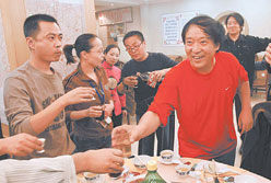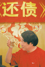 10日晚上,《還債》劇組舉行了開(kāi)機(jī)宴,由于高速公路起霧,牛群從北京趕到石家莊的時(shí)候已經(jīng)是晚上8點(diǎn)鐘。當(dāng)牛群一臉疲憊地出現(xiàn)的時(shí)候,他那已經(jīng)成為“攝影師、平民縣長(zhǎng)”標(biāo)志的馬甲并沒(méi)有穿在身上,而只穿了件紅色T恤和一件運(yùn)動(dòng)外套。讓記者感到第二個(gè)變化的是牛群的話少了,開(kāi)機(jī)宴上男主角牛群自然少不了講話,人們滿懷期待他能夠講出如相聲般的精彩話語(yǔ),可牛群只說(shuō)了兩句客套話便沒(méi)了下文,在給各桌敬酒的時(shí)候他的話更少,只是端一下酒杯而不開(kāi)口。