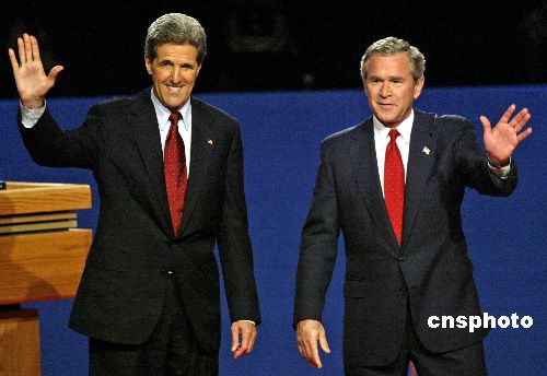 中新網(wǎng)10月14日電 美國總統(tǒng)候選人第三場辯論于美東時間13日晚9點在亞利桑那州立大學(xué)展開。由于是投票日前的最后一場辯論,布什與克里都將全力抓住這次給全國選民留下深刻印象、宣講施政方針、全面攻擊對方的最重要機會。