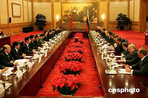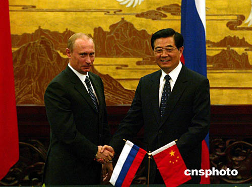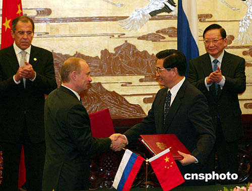 普京完全贊同胡錦濤的看法和建議,他說(shuō),發(fā)展俄中合作是俄一貫政策!抖碇心类徲押煤献鳁l約》為兩國(guó)關(guān)系發(fā)展奠定了重要基礎(chǔ),雙方解決邊境問(wèn)題、就俄加入世貿(mào)組織達(dá)成協(xié)議是兩國(guó)戰(zhàn)略協(xié)作伙伴關(guān)系的體現(xiàn)。我們?cè)概c中方切實(shí)落實(shí)該條約的實(shí)施綱要,推動(dòng)雙方在各領(lǐng)域的合作。俄方希望加強(qiáng)經(jīng)貿(mào)合作,爭(zhēng)取在數(shù)量和質(zhì)量上均不斷提高。他重申,俄方關(guān)于同中國(guó)的能源合作的決定始終未變,也愿同中國(guó)加強(qiáng)在科技、人文等領(lǐng)域的合作。