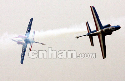 果然,經(jīng)過十多分鐘平淡無奇的單飛后,1號(hào)飛機(jī)著陸了,7號(hào)、8號(hào)飛機(jī)相繼升空。3時(shí)38分,兩架飛機(jī)做了當(dāng)天最驚險(xiǎn)也是惟一驚險(xiǎn)的動(dòng)作——對(duì)飛閃避:兩架飛機(jī)南北相向飛行,當(dāng)距離20米左右時(shí),兩機(jī)各向外側(cè)翻轉(zhuǎn)90度,兩機(jī)擦身而過,藍(lán)色和紅色的尾煙在天空劃出一道美麗的弧線。看到的觀眾一片驚呼,沒看到的大失所望。10分鐘后,表演順利結(jié)束。
