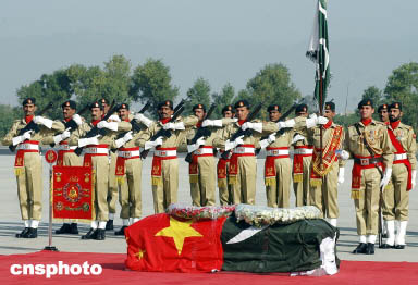 王鵬的靈柩上覆蓋著中巴兩國國旗,上面擺放著由鮮花組成的兩個花圈,在低沉悲涼的哀樂聲中,巴基斯坦陸軍儀仗隊為這位在人質事件中遇難的中國朋友舉行了莊嚴肅穆的遺體告別儀式。6名巴基斯坦禮兵將靈柩慢慢抬起,沿著紅色的地毯,緩緩走向運送遺體的專機。