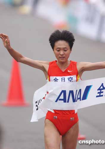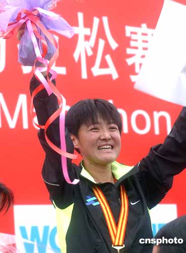 十月十七日,中國(guó)田徑名將孫英杰以2小時(shí)24分13秒的成績(jī)奪得北京國(guó)際馬拉松女子組冠軍。作者:武仲林