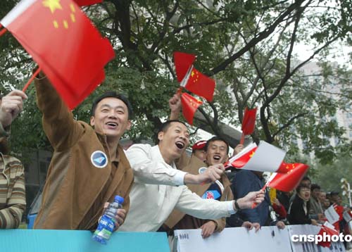 數(shù)十萬(wàn)北京市民沿途為二零零四北京國(guó)際馬拉松賽的運(yùn)動(dòng)員吶喊加油。作者:武仲林