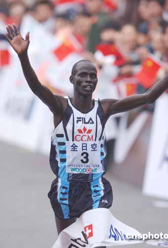 肯尼亞名將莫伊本以2小時(shí)10分34秒的成績(jī),奪得北京馬拉松男子組冠軍。作者:武仲林