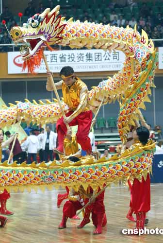 十月十九日,全國第五屆農(nóng)民運動會的舞龍規(guī)定套路決賽在江西省宜春市體育中心進行,湖南代表隊?wèi){借精彩的表演奪取本屆舞龍比賽項目中的第一枚金牌。圖為湖南代表隊在比賽中。作者:盛佳鵬