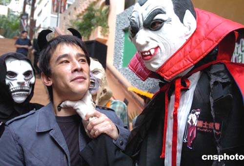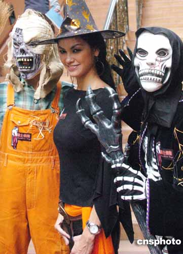 萬(wàn)圣節(jié)將臨,香港尖沙咀最新型人蒲點(diǎn)的諾士佛階,二十日率先展開(kāi)迎接萬(wàn)圣節(jié)活動(dòng),圖為扮成嘩鬼的男士與出席活動(dòng)的男模吳嘉龍做戲。作者:錢興強(qiáng)