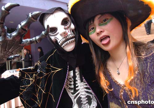扮成各種萬(wàn)圣節(jié)型人潮鬼形象的少男少女在“階”上逛蕩,吸引游客。 作者:錢興強(qiáng)