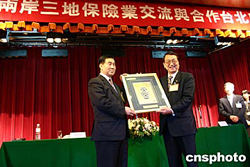 圖為會(huì)議結(jié)束時(shí)中國(guó)保險(xiǎn)行業(yè)協(xié)會(huì)主席王憲章(左),與臺(tái)灣保險(xiǎn)學(xué)會(huì)理事長(zhǎng)王事展互致紀(jì)念品。