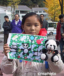 中國(guó)四川臥龍自然保護(hù)區(qū)是地球上僅存的大熊貓棲息地之一,其數(shù)量占全球大熊貓總數(shù)的百分之二十。圖為當(dāng)?shù)匾晃粌和谙蛴稳苏故咀约旱淖髌,呼吁保護(hù)世界最稀有的瀕危動(dòng)物大熊貓。作者:張華