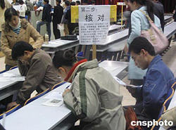 2005年全國(guó)碩士研究生招生首次在全國(guó)范圍內(nèi)試行網(wǎng)上報(bào)名,考生須于11月10日至14日到省級(jí)招生辦指定的報(bào)考點(diǎn)確認(rèn)報(bào)名信息才能有效。圖為報(bào)考中國(guó)人民大學(xué)碩士研究生的學(xué)生11月10日在現(xiàn)場(chǎng)仔細(xì)核對(duì)自己的報(bào)名信息。作者:張碩