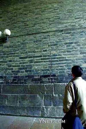 昨天下午,記者在正陽門西北角看到,近9米高的城墻上確實(shí)有一道裂縫。記者目測(cè)后估計(jì)裂縫長(zhǎng)約6米,但寬不過半厘米。裂縫從城墻頂部開始向下分段延伸,在接近地面處消失。住在附近的居民說,他們也是最近才發(fā)現(xiàn)城樓西北角的這道裂縫。不過居民們說,在城樓的門洞里還有大小不等的幾道裂縫。