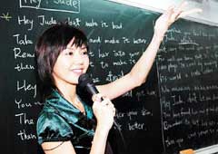“孫老師”教學(xué)果然魅力十足,逐句逐字解釋,還加輕哼吟唱,孫老師點名學(xué)生上臺唱一遍,還大玩英文押韻游戲,臺上、臺下的互動自然深刻,她笑說:“我在新加坡念行銷時,數(shù)學(xué)和各科都是以英文學(xué)習(xí),所以教英文對我來說不難,希望大家未來的英文愈來愈好,能真正體驗每首歌詞的美妙意境!”