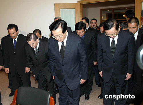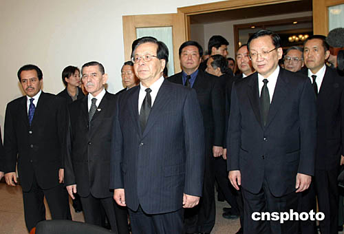 曾慶紅、唐家璇在巴勒斯坦國駐華使館向阿拉法特主席靈像鞠躬哀悼。