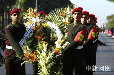11月12日,在埃及首都開羅,埃及士兵抬著向已故巴勒斯坦民族權(quán)力機(jī)構(gòu)主席阿拉法特敬獻(xiàn)的花圈。