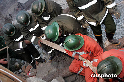 二零零四年十一月二十二日,“11.20”河北沙河礦難救援工作仍在進行。截止當日十九時三十分,河北沙河礦難遇難礦工人數(shù)已達五十七人,另有三人人下落不明。圖為消防戰(zhàn)士向出事礦井運送傳輸水袋,以撲滅仍在燃燒的大火。中新社記者:武仲林