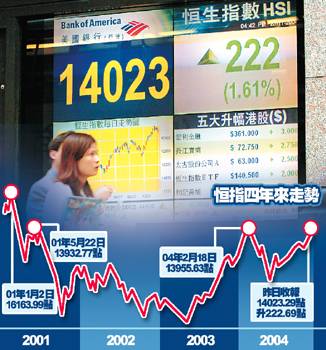 相關報道:港股升破一萬四千點 資金持續(xù)流入料升浪可續(xù) (2004-11-24 08:34:18)