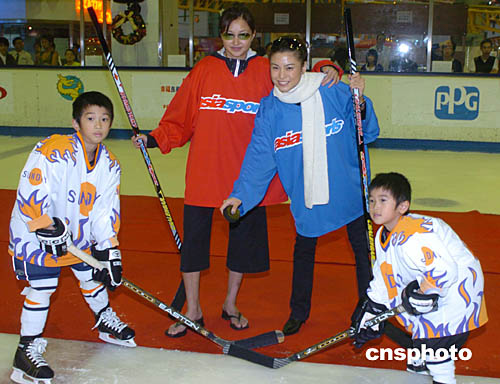 香港藝人李綺虹﹑廖碧兒25日在香港西九龍中心為2004年亞太區(qū)少兒冰球賽開(kāi)球。