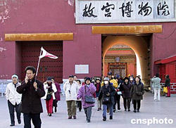 北京的六大世界文化遺產門票擬上漲的消息傳出后,打電話給各大旅行社咨詢報名北京游的各地民眾猛增。據(jù)國旅假期國內旅游觀光分公司總經理黃就明稱,目前推出的“北京雙飛團五天豪華團游”價格為一千四百三十八元人民幣,包括了游故宮、八達嶺長城、天壇、頤和園、定陵五大景點。如門票總價格上調一百三十五元,團費也將隨之上升,升幅將近一成。圖為12月8日上午一隊游客剛從故宮出來。作者:張碩