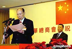 全國(guó)政協(xié)副主席、澳門(mén)中華總商會(huì)會(huì)長(zhǎng)馬萬(wàn)祺,16日在澳門(mén)中華總商會(huì)慶祝澳門(mén)特別行政區(qū)成立五周年酒會(huì)上致辭,澳門(mén)特別行政區(qū)行政長(zhǎng)官何厚鏵參加酒會(huì)。作者:宋吉河