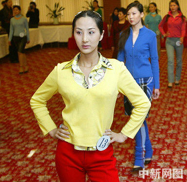 變性人劉小靜與其他參賽選手們練習(xí)臺步,她們?yōu)橹袊讓谜涡〗愦筚愖鲎詈笠淮尾逝。整形是世界選美的一大禁忌,而19名參賽選手將于12月18日在北京角逐全國“人造美女”稱號。