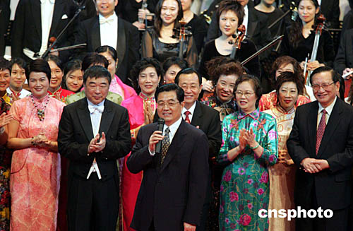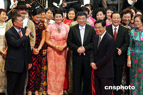 十二月二十日上午,國家主席胡錦濤在澳門文化中心觀看了慶祝回歸五周年文藝演出后,上臺與演員們握手并表示感謝。作者:宗金柱