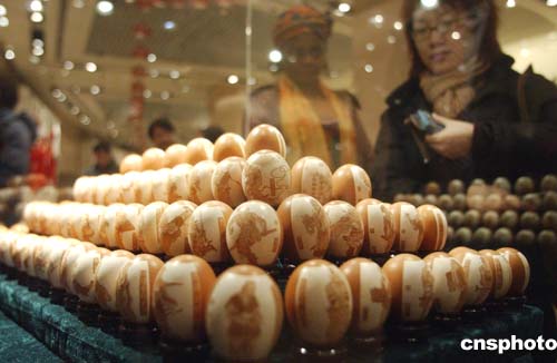 十二月二十六日,中外游人正在觀看用雞蛋殼雕刻出的《水滸》人物“一百單八將”。二十四日,北京民間藝術(shù)展開始在中華世紀(jì)壇舉行,同時(shí)展出的還有風(fēng)箏、泥塑、面塑、毛猴、剪紙、蛋雕、京劇臉譜等二十多個(gè)藝術(shù)門類的二百八十件民間工藝品。作者:韓藝冰