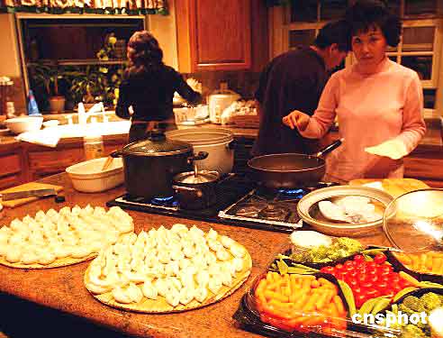 美國洛杉磯的一個(gè)華人家庭在圣誕節(jié)之夜舉辦家庭沙龍,親朋好友在廚房包中國餃子,在這個(gè)西式節(jié)日里享受中國傳統(tǒng)美食。賈國榮 2004-12-26 12:43:25